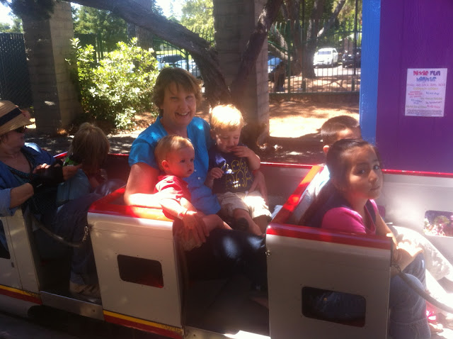 another day we found a delightful beach in half moon bay. william wasn't too interested in the water as always but cal would have crawled right into the ocean if he'd has his way.then onto pixieland a tiny tiny amusement park which was the perfect size for the boys. they rode the train with grandma and experienced the tea cups which they didn't quite understand.